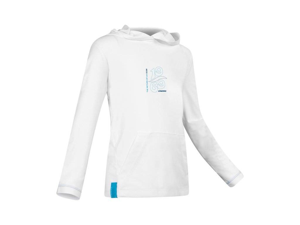 Dětská mikina s kapucí Camaro Lycra LS "1969" v elegantní bílo-modré kombinaci je ideálním společníkem pro vaše děti na pláž i do vody. Tato mikina je vyrobena z kvalitního recyklovaného nylonu a elastanu, což zajišťuje nejen pohodlí, ale také šetrnost k životnímu prostředí.