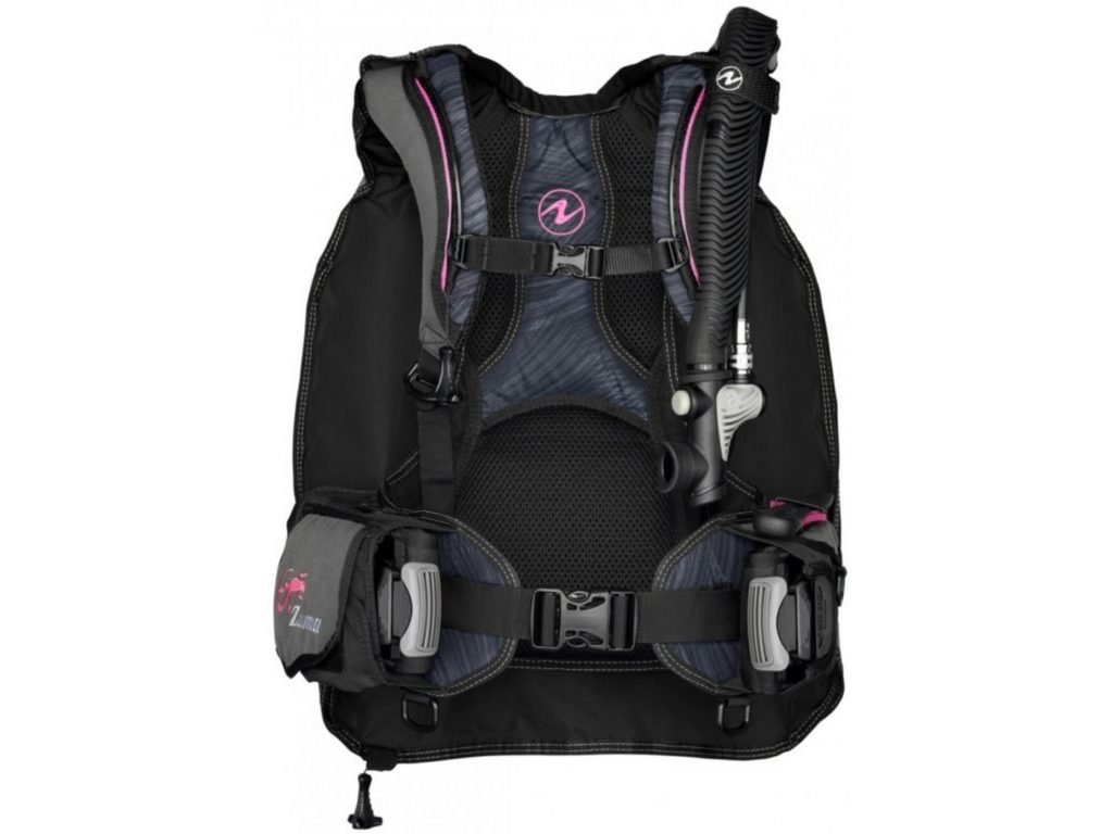 Anatomicky tvarované ramenní popruhy, výztuž páteře a beder poskytují maximální komfort během ponorů. Rozvinovací kapsa na pravé straně je snadno dosažitelná, zatímco čtyři plastové D-kroužky umožňují přichycení různého příslušenství. Výpustný ventil je strategicky umístěn na pravém rameni a vzadu na pravé straně pro snadnou manipulaci.