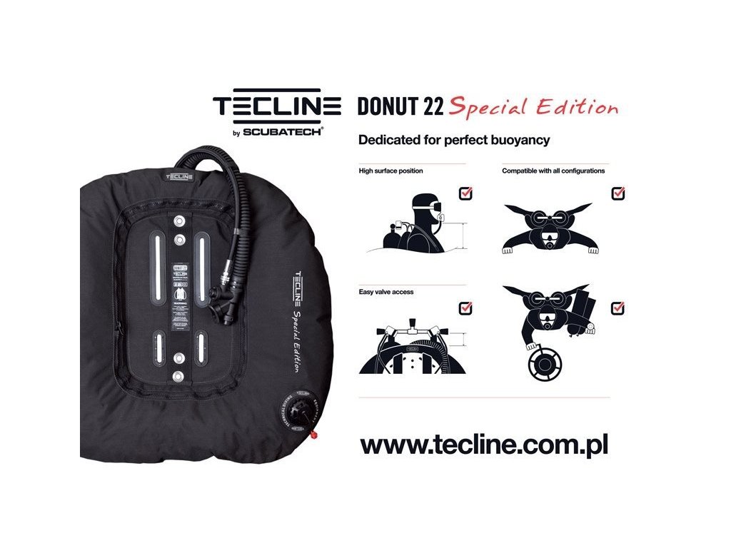Křídla Tecline splňují i nejnáročnější požadavky technicky zaměřených potápěčů. Mají velmi dobré vyvážení, snadnou dostupné ventily a lehký plastový inflátor pro snadné ovládání, bez pozdějších problému se servisem – oceníte zejména při cestování. Záruka v délce 5let na stálost barvy vnějšího materiálu. V ceně křídla je inflátorová LP Proflex hadice, vrapová hadice o délce 40 cm a transportní obal.