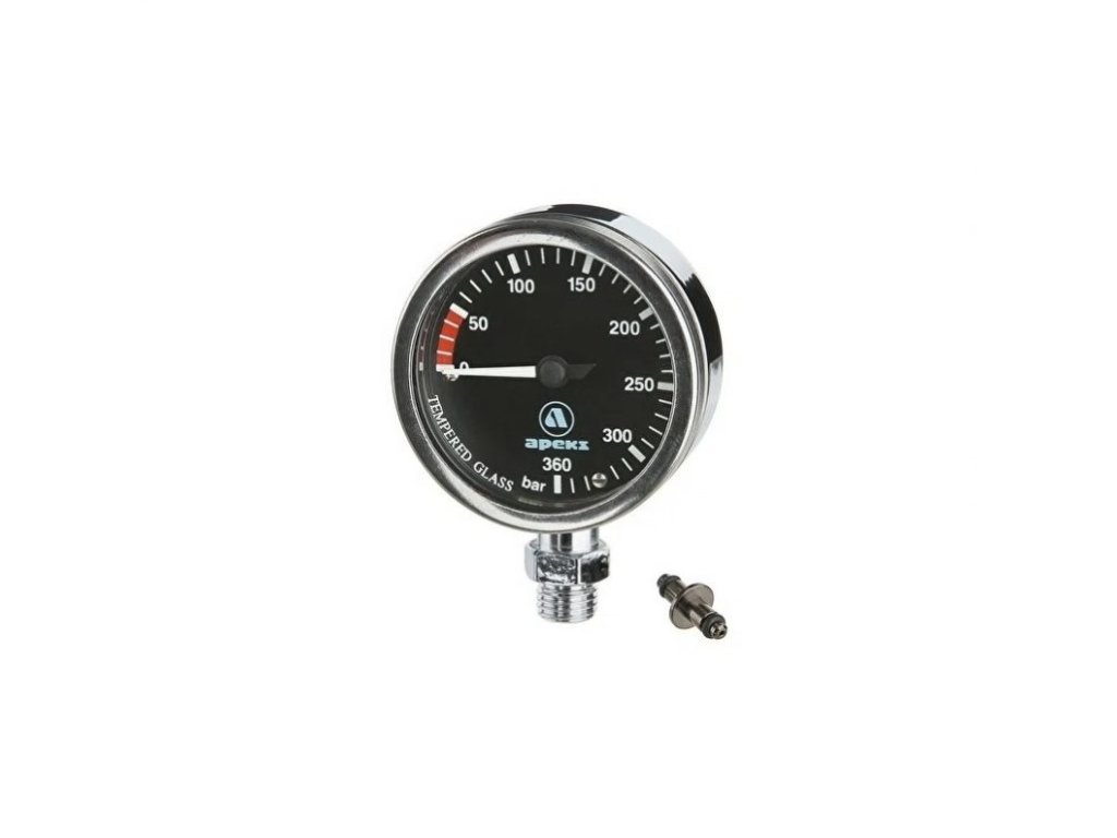 Kvalitní kovový manometr firmy APEKS s černou stupnicí a tělem z niklované mosazi.