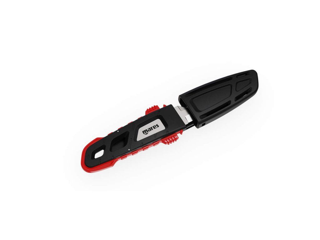 • Snadné odjištění a zajištění nože klipem jednou rukou • Velká tvarovaná rukojeť • Pevné plastové pouzdro • Pasuje do průchodek pro uchycení nože Mares BCD • Nerezová ocel 420, délka čepele 70 mm • Rovná čepel • Vroubkovaná čepel • Řezák šňůr • Plochá špička