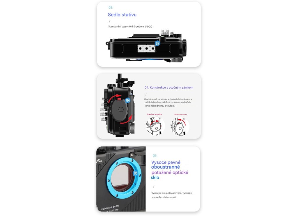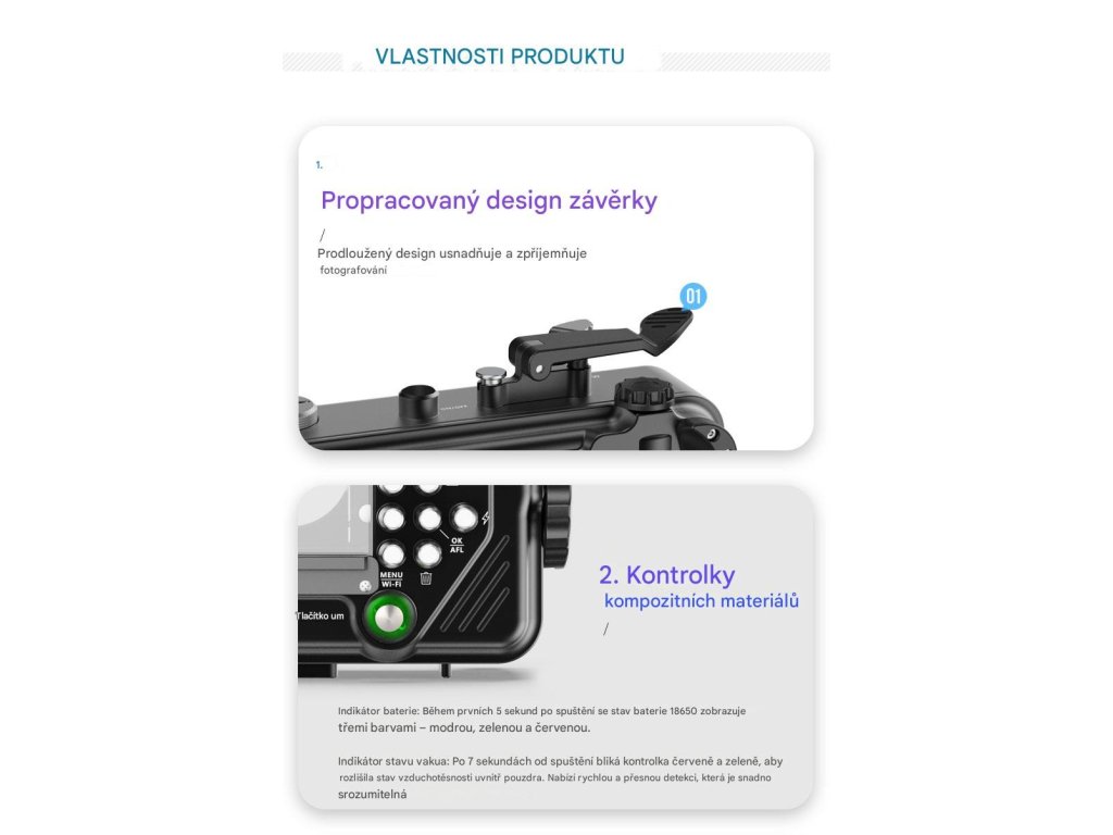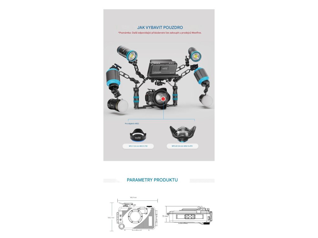 Vysoce pevné podvodní pouzdro Weefine, vyrobené z hliníkové slitiny. Díky této pevné konstrukci lze toto pouzdro ponořit do hloubky 100 metrů. Má také rychlý odvod tepla, což eliminuje kondenzaci na LCD displeji a objektivu.