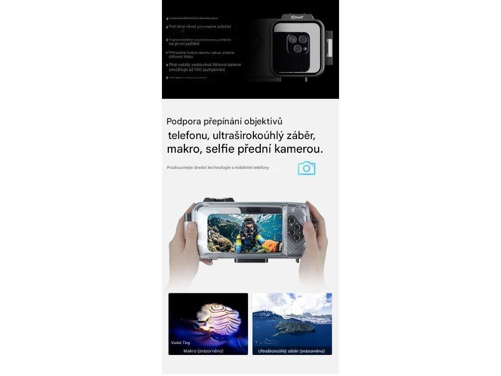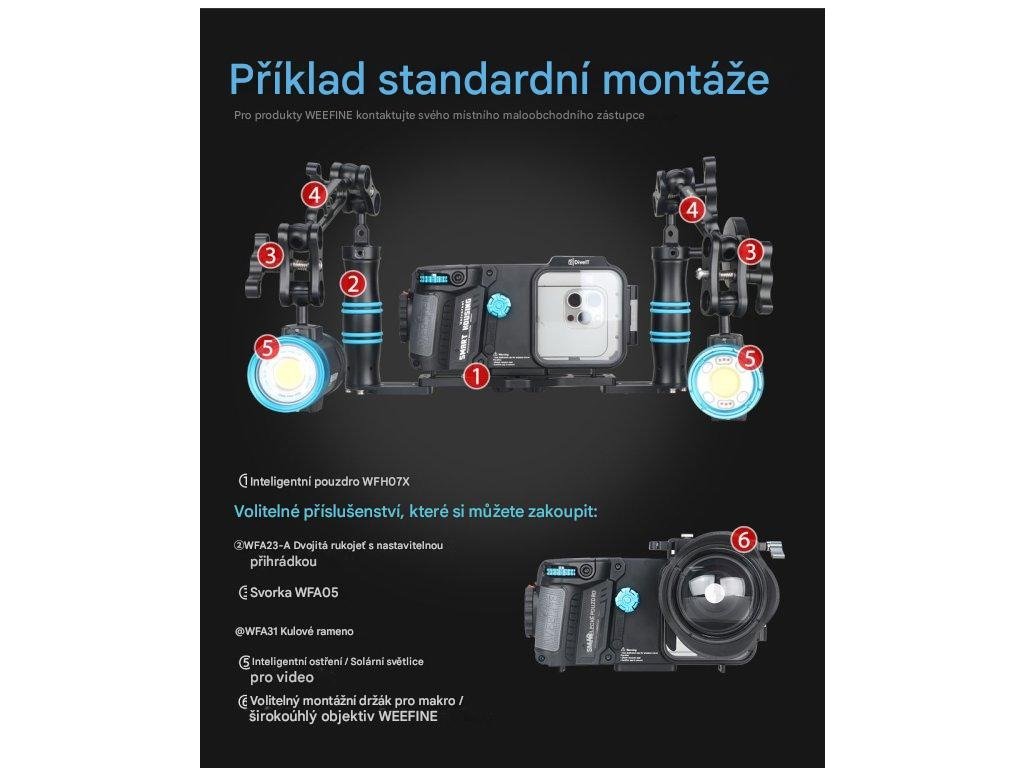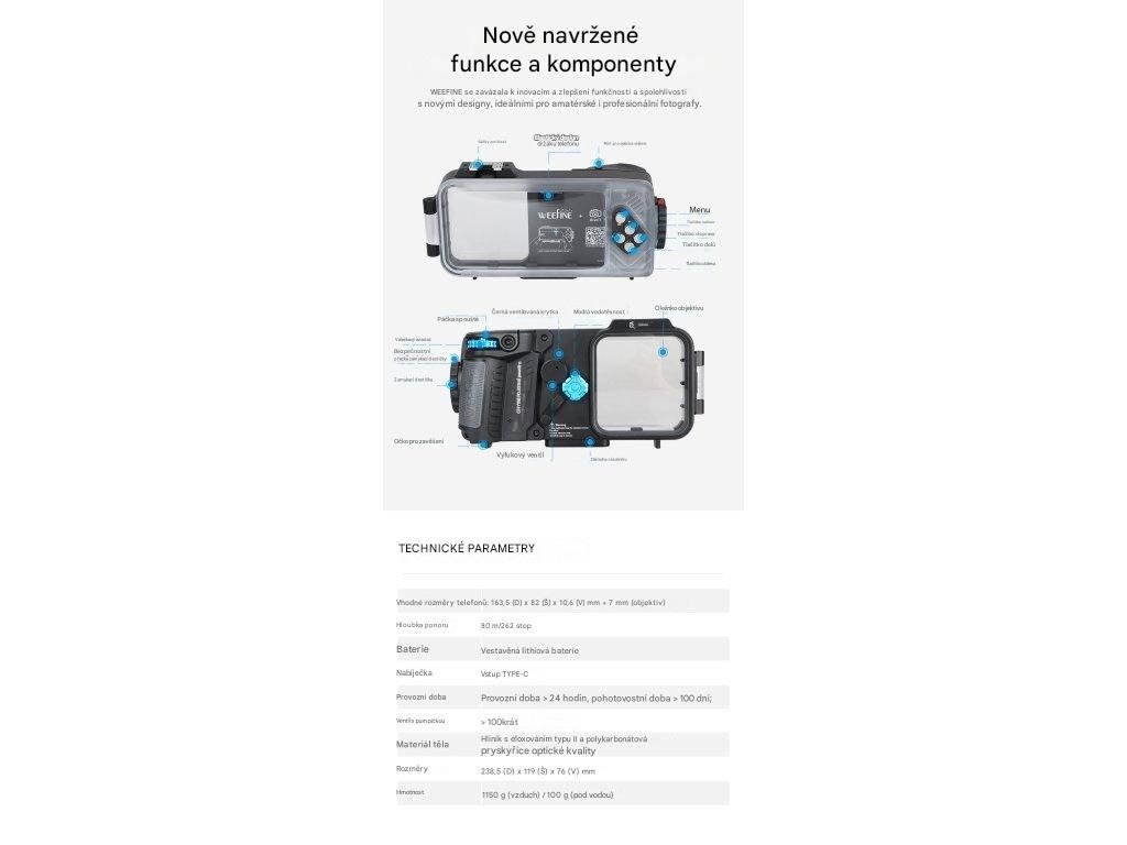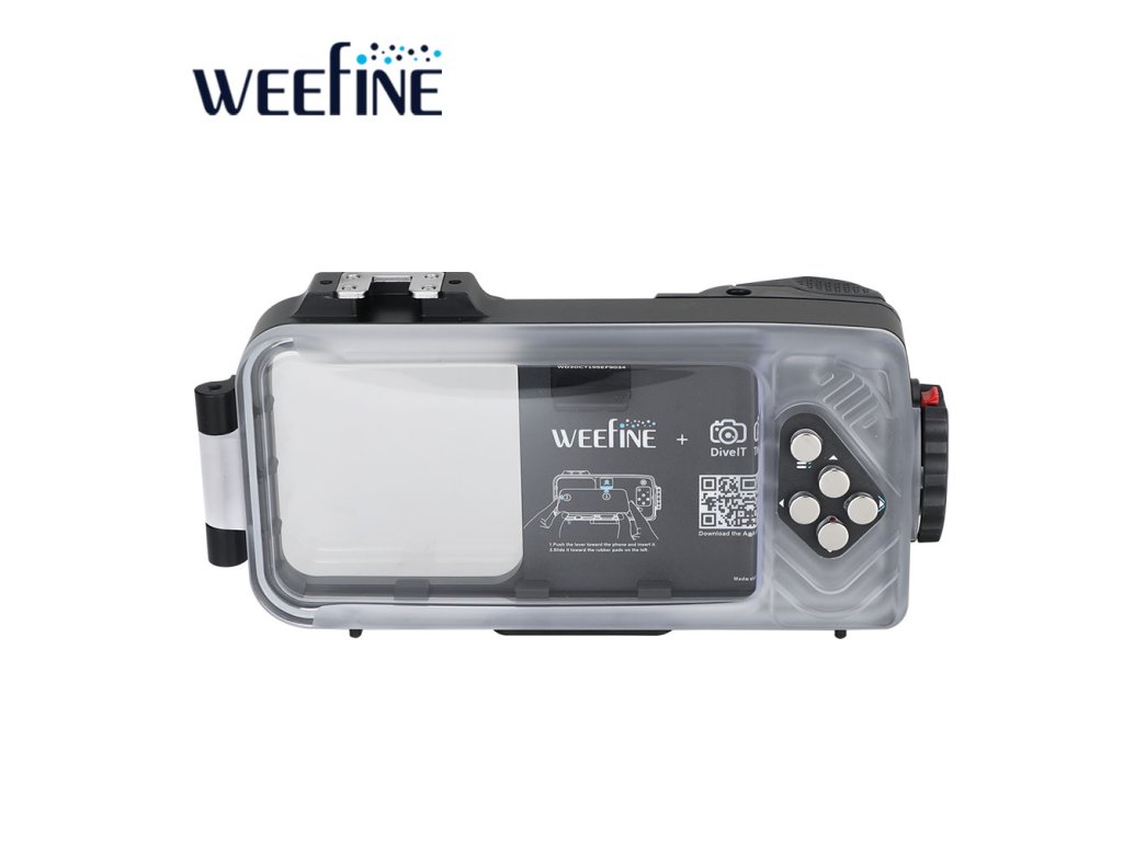 Chytré pouzdro Weefine WFH07X je vybaveno externími tlačítky, která umožňují hmatové ovládání funkcí fotoaparátu telefonu, včetně spouště, zoomu, videa a přepínání mezi předním a zadním fotoaparátem. Rozložení je navrženo pro použití v rukavicích, což zajišťuje snadné používání při potápění. Součástí je držák cold shoe a 1/4“ stativový závit pro připojení externích videosvětel, zásobníků nebo ramen. Port pro optické vlákno umožňuje připojení stroboskopů nebo externích osvětlovacích systémů, čímž vylepšuje nastavení osvětlení pro makrofotografii a širokoúhlou podvodní fotografii.