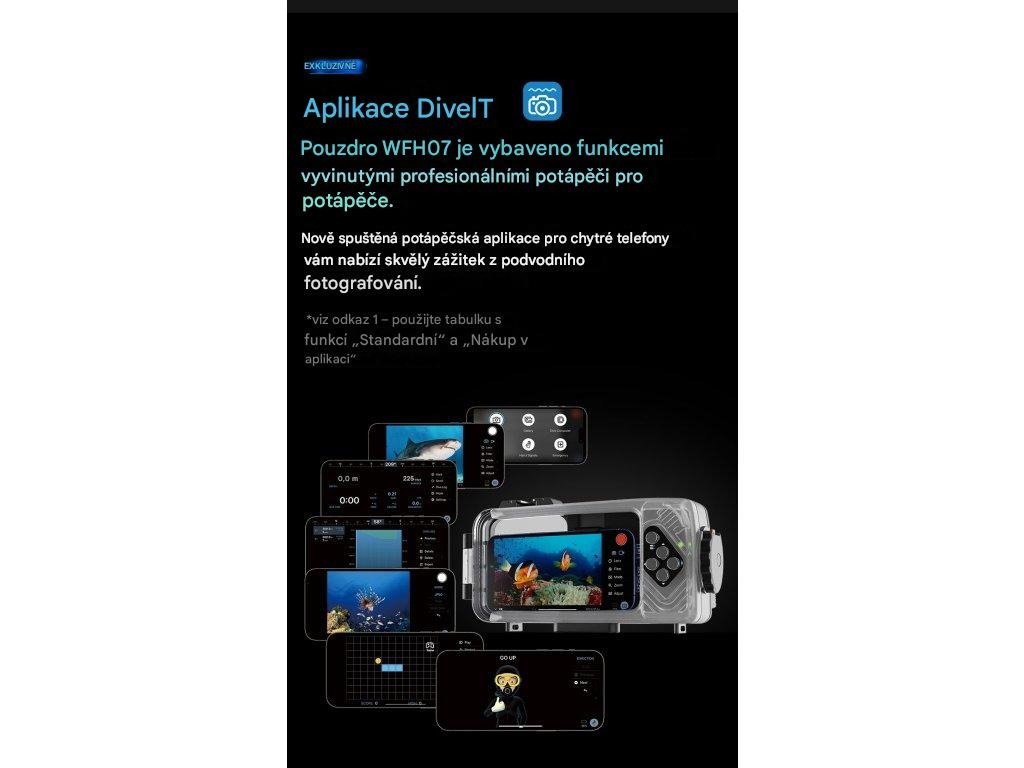 Díky integrovanému snímači hloubky a teploty přidává podvodní pouzdro pro chytré telefony WFH07 k vašim fotografiím a videím překryvné údaje o potápění. Vzniká tak pohlcující obsah s vloženými údaji o hloubce, teplotě vody a dalšími metadaty nezbytnými pro vědecké využití i pro vyprávění dobrodružných příběhů. pouzdro funguje po spárování s aplikací Dive Housing také jako digitální potápěčský počítač. Ta zahrnuje sledování hloubky, doby ponoru, rychlosti výstupu a limitů bez dekomprese v reálném čase.