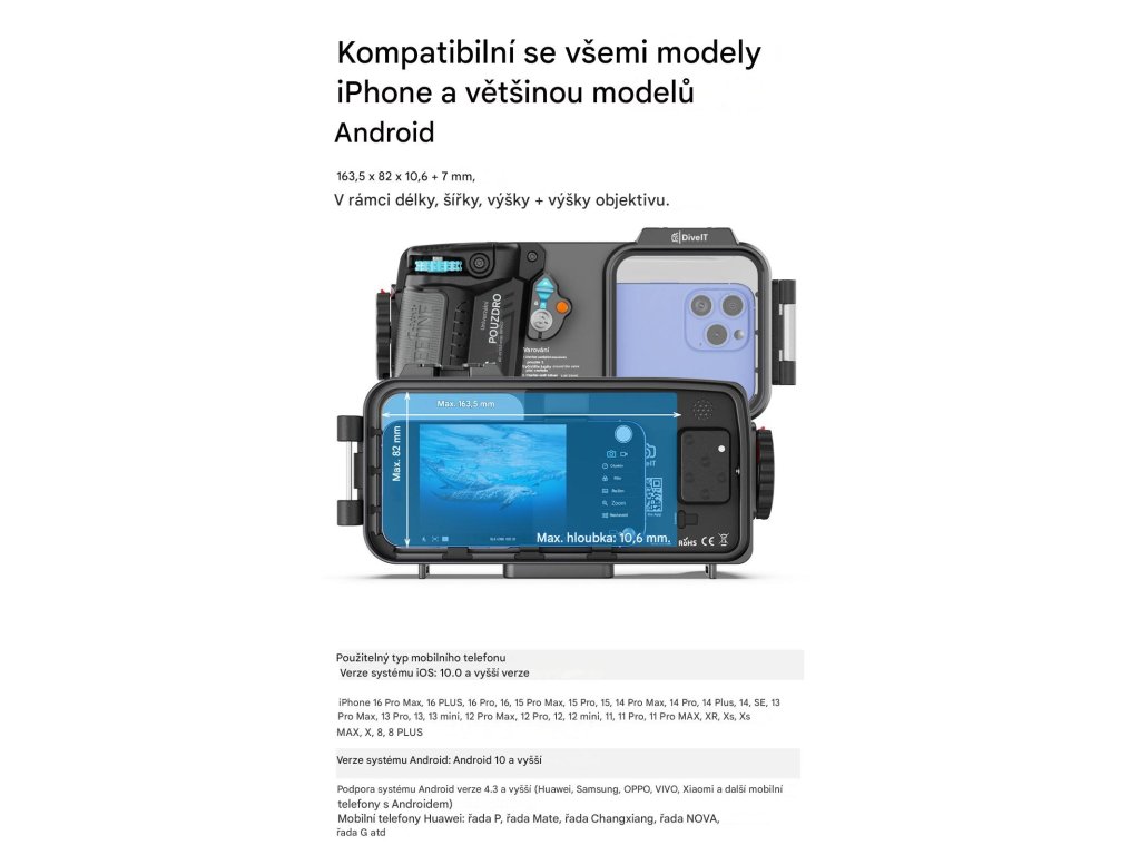 - Univerzální kompatibilita: Kompatibilní s většinou modelů iPhonů a Androidů: Pojme chytré telefony o rozměrech až 163,5 x 82 x 10 mm.