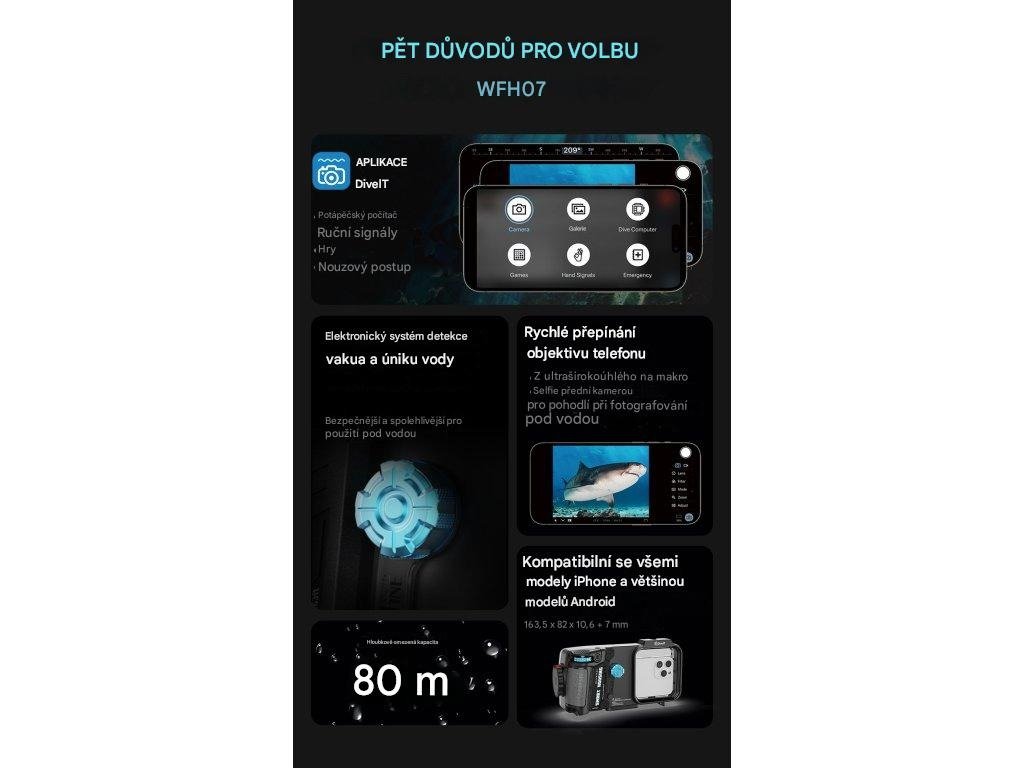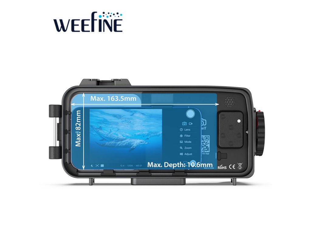 Chytré pouzdro Weefine WFH07X podporuje chytré telefony s rozměry až 163,5 x 82 x 10 mm, což vyhovuje většině zařízení se systémy iOS a Android na trhu. Umožňuje také vyboulení fotoaparátu až do 7 mm, což zajišťuje bezpečné uchycení telefonu bez rušivých vlivů. Toto podvodní pouzdro pro chytré telefony je kompatibilní s aplikací Dive+ a aplikací Weefine Dive Housing (iOS a Android), takže je univerzální pro základní i pokročilé uživatele. Chytrý telefon se připojuje přes Bluetooth, což umožňuje intuitivní ovládání nastavení fotoaparátu i v hloubce.