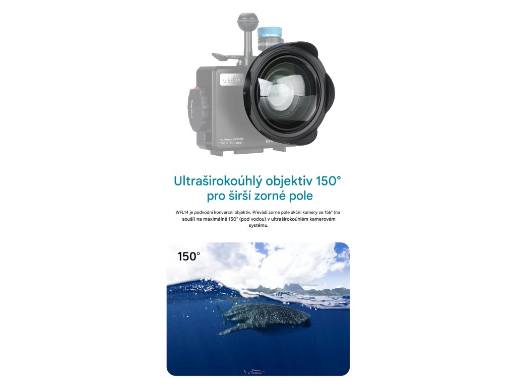 Určeno pro pouzdra na akční kameru Weefine (WFH-GP1). Tato ultraširokoúhlá podvodní předsádka WFL14 je určena pro použití s akčními kamerami a smartphony vybavenými 1palcovými snímači. Předsádka výrazně zlepšuje optickou kvalitu, a to i při použití superširokoúhlého režimu fotoaparátu (156°). Poskytuje rovnější linie, lepší kontrast a celkově úchvatnější snímky.
