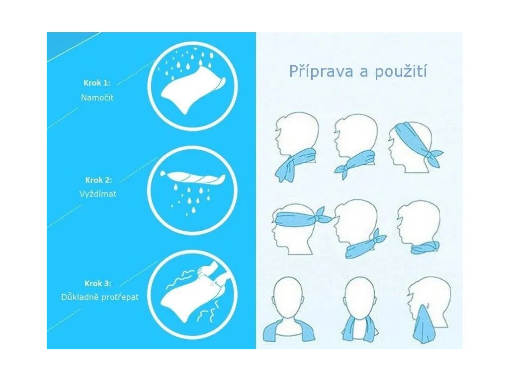 Ručník zůstane chladný až 3 hodiny (v závislosti na podmínkách). Při výrobě chladicích ručníků se nepoužívají žádné chemické látky. Je ideální při návalech horka, venkovních aktivitách, cvičení v interiéru, léčbě horečky nebo bolesti hlavy, prevenci úpalu, ochraně před slunečním zářením, chlazení při absorpci.