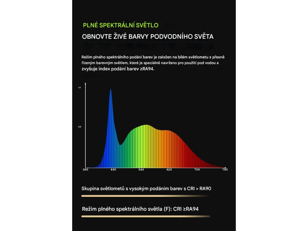 - Specializované režimy: Zahrnuje červený paprsek (100 lumenů) a UW modrý paprsek (6 W) pro fluorodiving.