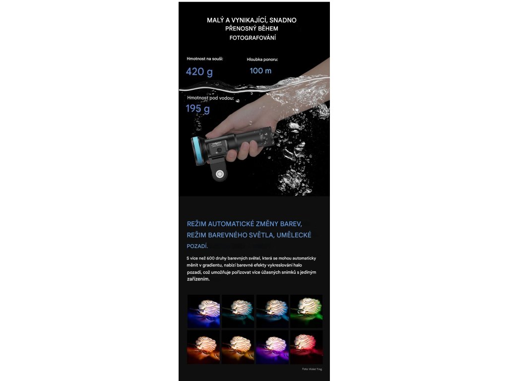 Světlo je vhodné pro potápěče a podvodní videografy, kteří hledají univerzální řešení pro různé světelné podmínky, včetně podpory fluorodivingu a kreativních barevných efektů.