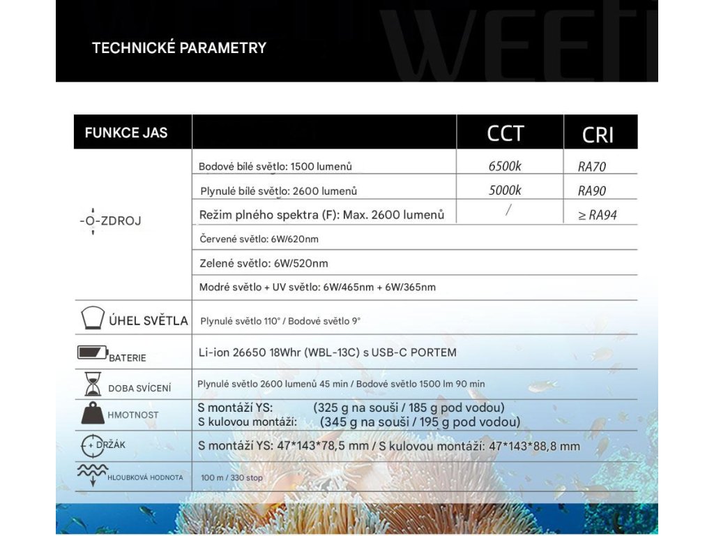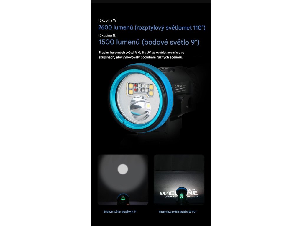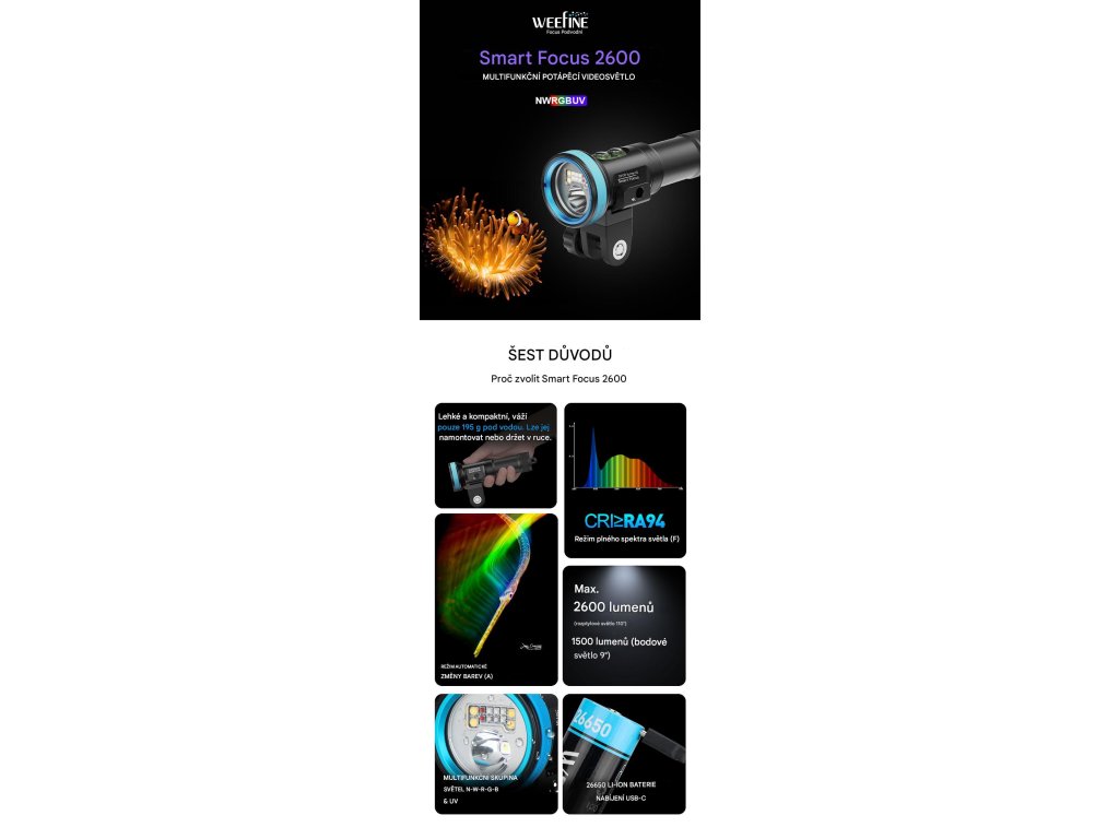 Světlo Weefine Smart Focus 2600 představuje univerzální videosvětlo určené pro potápěče a zájemce o podvodní fotografii a video. Toto kompaktní zařízení s výkonem 2500 lumenů a vysoce kvalitní řadou LED COB poskytuje spolehlivé osvětlení pro širokou škálu podvodních aktivit, od běžného natáčení až po specializovaný fluorodiving.