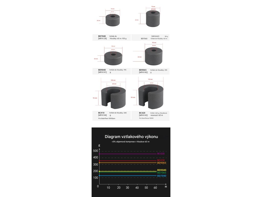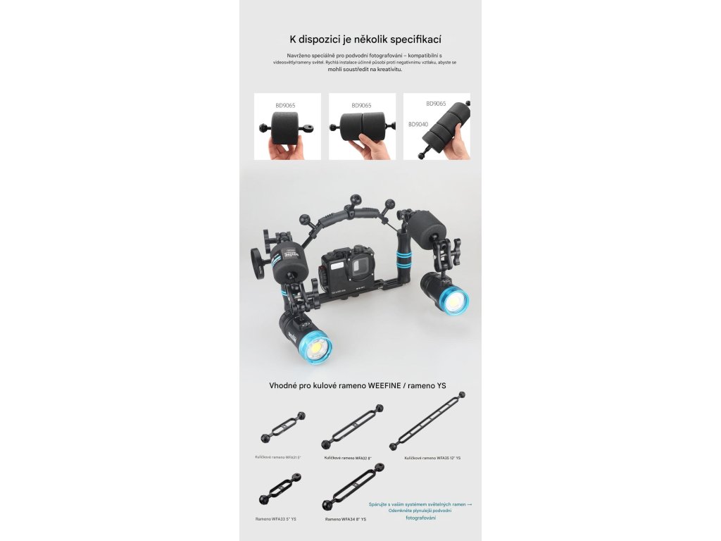 Vztlakový blok Weefine pro rameno (105g) je komponenta pro podvodní fotografické systémy. Slouží k vyrovnání a kontrole vztlaku podvodních fotoaparátů, které s kryty, světly a rameny často vykazují negativní vztlak. Zlepšuje ovladatelnost a snižuje fyzickou námahu při manipulaci pod vodou.