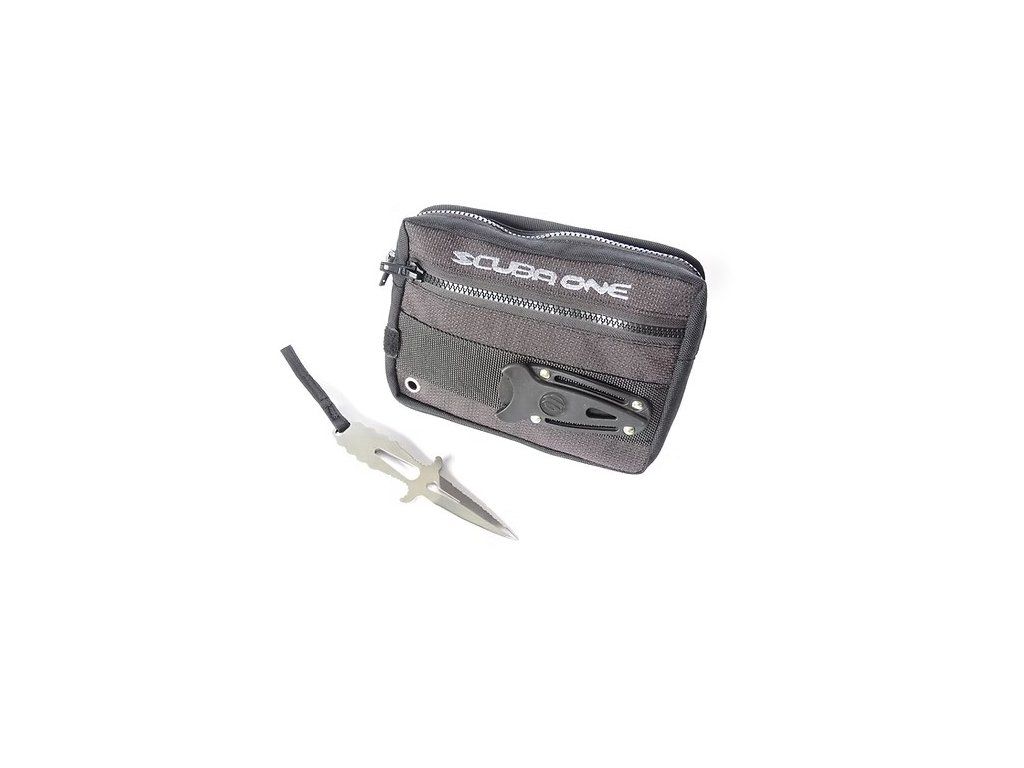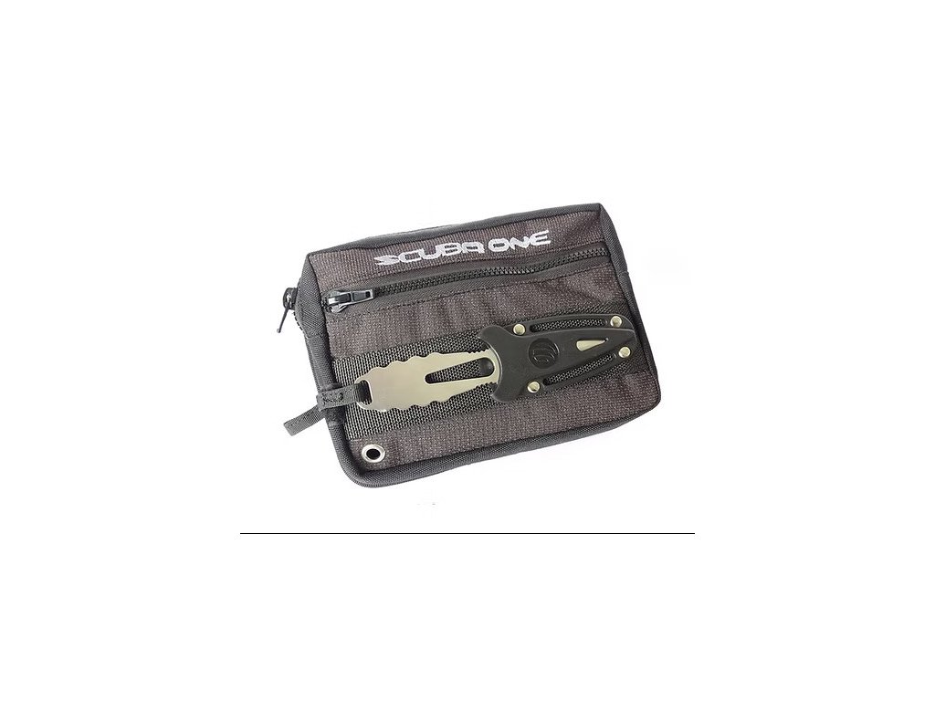 Úložná kapsa z KEVLARU a CORDURY 1OOO se dvěma nezávislými přihrádkami s dvojitým zipem. Na přední straně je nůž z nerezové oceli s pouzdrem a bezpečnostní tkaničkou.